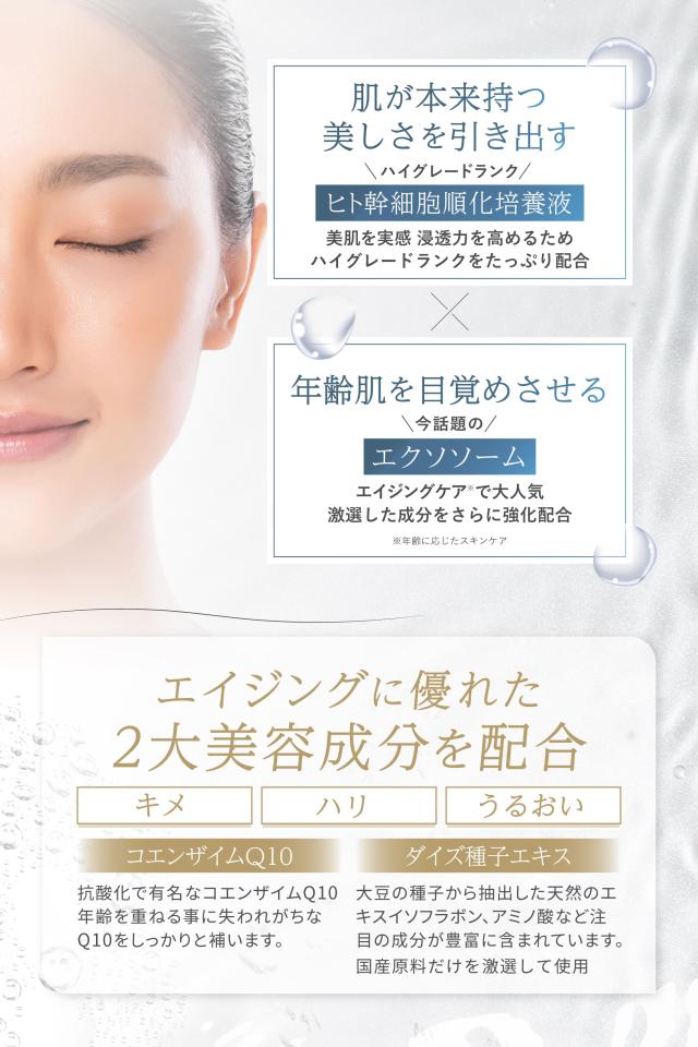 加水分解コラーゲンエキス,水(富士の天然水),グリセリン,イソペンチルジオール,ナイアシンアミド,ヒトサイタイ血幹細胞順化培養液,プラセンタエキス,PEG-60水添ヒマシ油,ツボクサエキス,ヒト遺伝子組換オリゴペプチド-1,ヒト幹細胞順化培養液,ヒト脂肪由来間葉系細胞エクソソーム,ヒアルロン酸Na,ヒアルロン酸クロスポリマーNa,アセチルヒアルロン酸Na,加水分解ヒアルロン酸,加水分解ヒアルロン酸アルキル(C12-13)グリセリル,セラミドAP,セラミドNG,セラミドNP,フィトスフィンゴシン,ヘキサペプチド-33,ユビキノン,水溶性コラーゲン,加水分解コラーゲン,ニコチンアミドモノヌクレオチド,パルミチン酸レチノール,レチノール,3-グリセリルアスコルビン酸,グリセリルアスコルビン酸,アスコルビルメチルカルボニルペンタペプチド-72-トリ-t-ブチルトリプトファナミド,酢酸トコフェロール,アラントイン,グリチルリチン酸2K,ピリドキシンHCl,コプチスチネンシス根茎エキス,ダイズ種子エキス,シラントリオール,1,2-ヘキサンジオール,BG,エタノール,カプリリルグリコール,ステアリン酸エチルヘキシル,トリ(カプリル酸/カプリン酸)グリセリル,ペンチレングリコール,コレステロール,ダイズステロール,ベヘニルアルコール,キサンタンガム,ヒドロキシプロピルメチルセルロースステアロキシエーテル,(ジイソステアリン酸/ポリヒドロキシステアリン酸/セバシン酸)ポリグリセリル-4,イソステアリン酸Na,ココイルサルコシンNa,ステアロイルラクチレートNa(ステアロイル乳酸Na),ペンタステアリン酸ポリグリセリル-10,ポリソルベート80,ラウリン酸ポリグリセリル-10,レシチン,水添レシチン,クエン酸,クエン酸Na,リン酸2Na,リン酸K,フェノキシエタノール