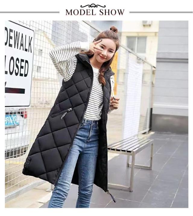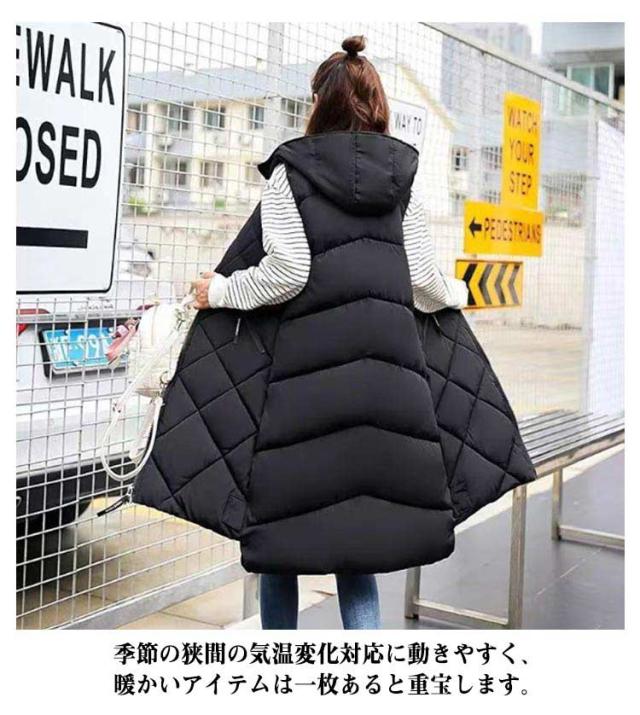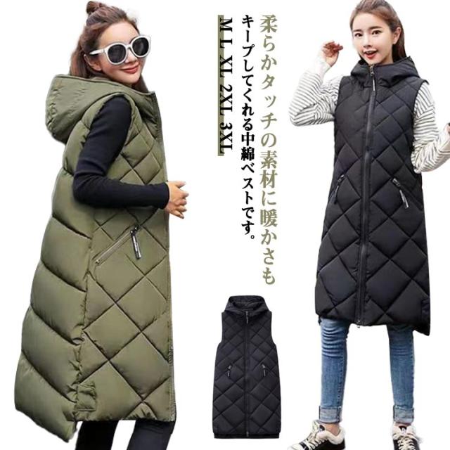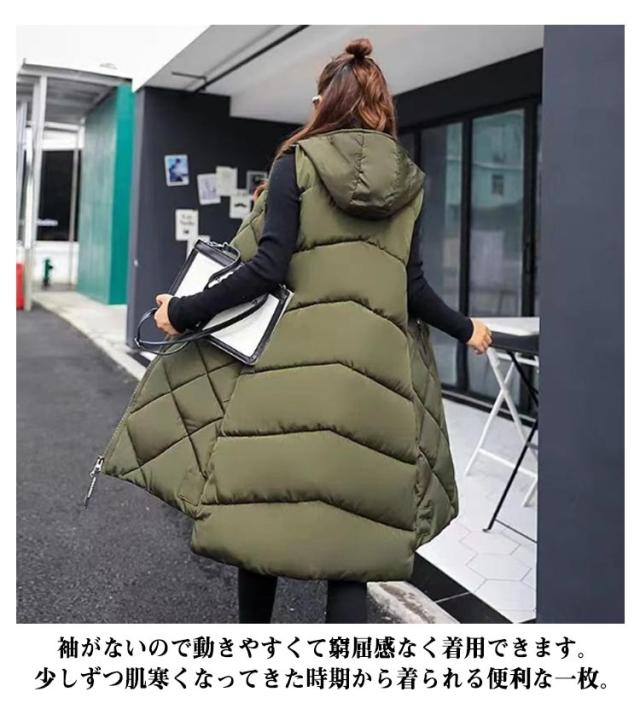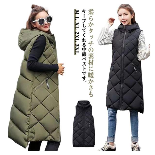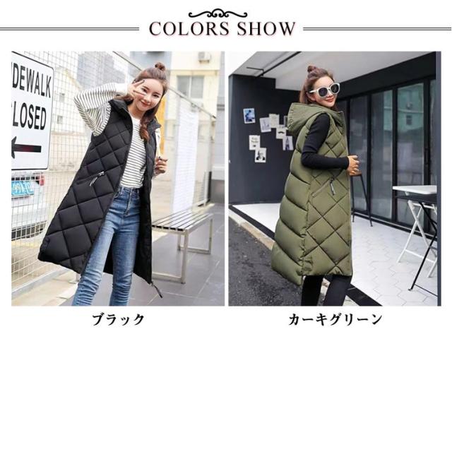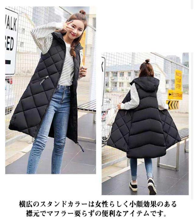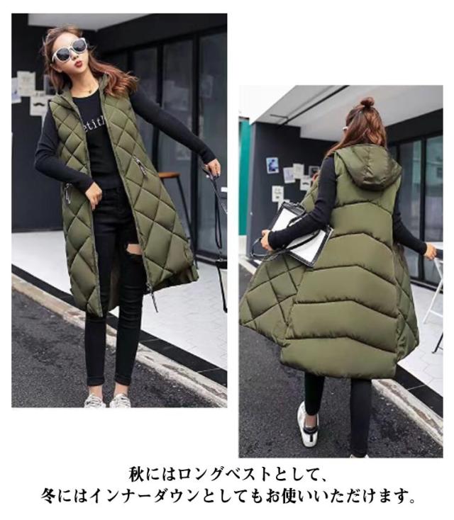 中綿ベスト ロング丈 ダウンベスト ロングベスト レディース 秋冬 フェイクダウン ベスト ロング丈 コート ジャケット アウター フード付き 前後差 ロング丈 ノースリーブ 上着 羽織り ハイネック 軽い 軽量 通勤 通学 暖かい 無地 お出かけ 秋冬 体型カバー