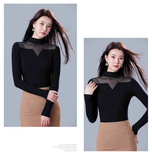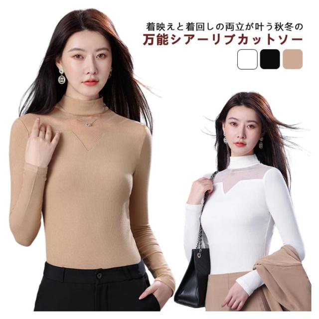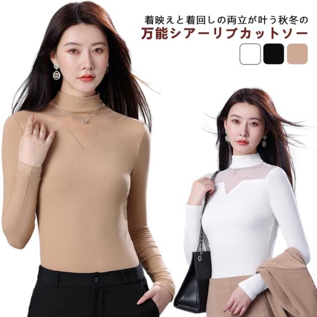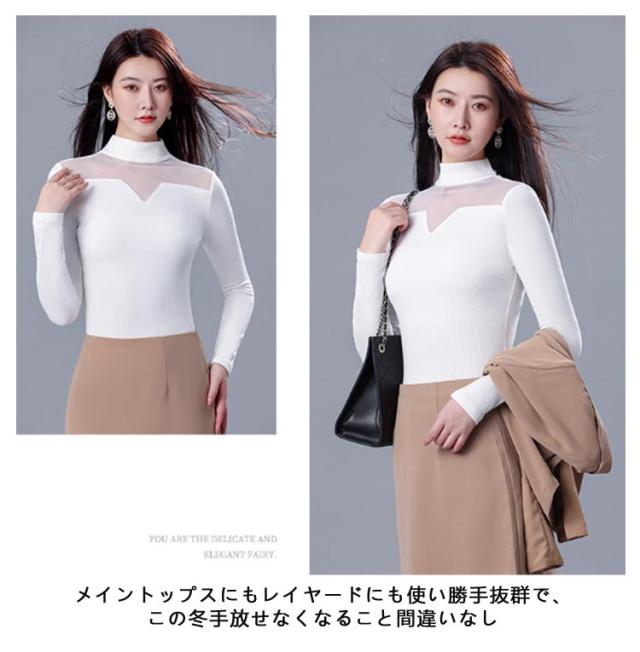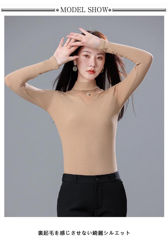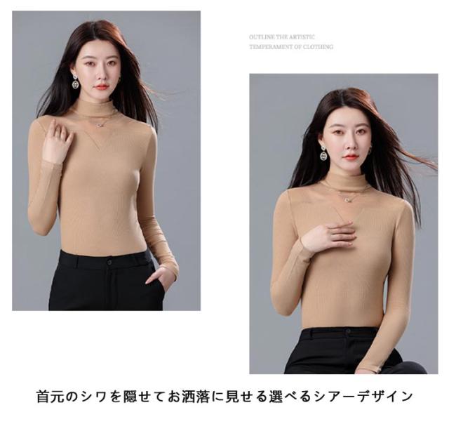 ニット リブ シア—トップス 裏起毛 微起毛 モックネック ストレッチ レイヤード インナー カットソー 首元 シワ隠し 重ね着 上品 大人 通勤 オフィスカジュアル 肌見せ 透け感