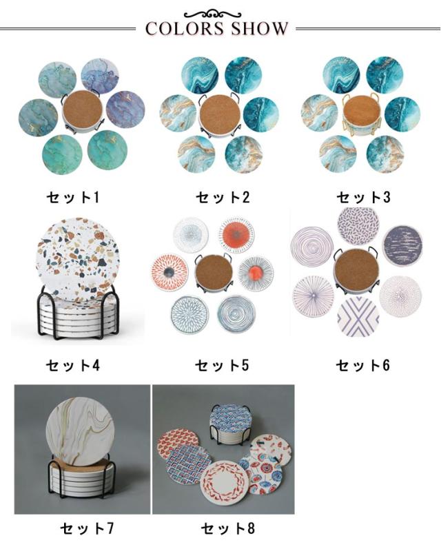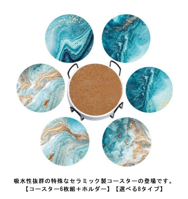 | 吸水性抜群の特殊なセラミック製コースターの登場です。【コースター6枚組+ホルダー】【選べる8タイプ】 【上質セラミック】コースターは上質なセラミックを採用しました。「断熱性」に優れ、熱いカップを乗ったら、テーブルやデスクを高熱から保護できます。吸水性がよい、冷たい飲み物が溶けた時の結露や残された汚れを素早く吸収し、机の乾燥や清潔を保ち、湿気を防ぎ、細菌を抑えます。 【抜群な吸水力】驚きの超吸水力でカップの外の水滴や結露を急速に吸水できます。吸収した水分は揮発しやすいです。使い終わったら、少し風通しのよいところに置くだけ、乾燥の手間もかかりません。 【保護コルク裏面】コースターの底部ではコルクマットが付き、テーブルとの摩擦を効果的に減少し、家具をより良く守れます。また、滑り止めの効果に優れています。 【ギフトとしておすすめ】カフェ、飲食店、来客のお茶出し用だけではなく、独特なセンスが示す大理石模様のコースターは、御挨拶・引越し・贈答・新築・祝用・誕生日・記念日・卒業などに、ご家族やお友達、上司、先生への素敵なギフトとしてオススメです。 | |