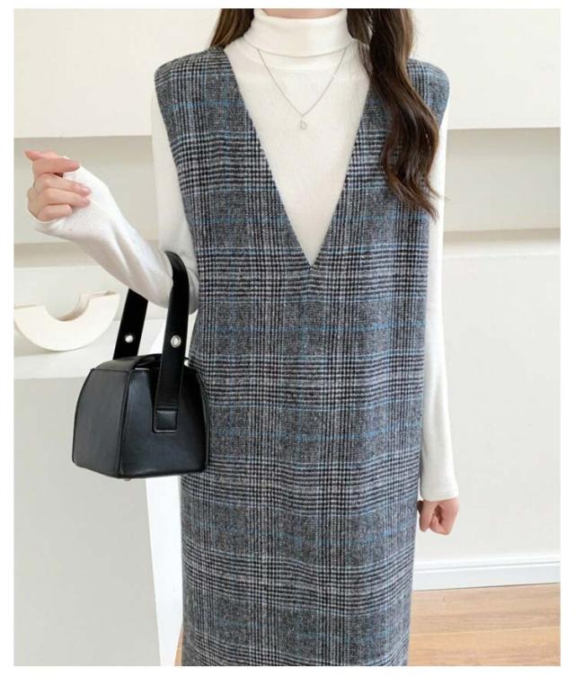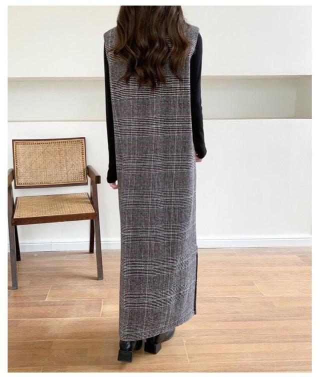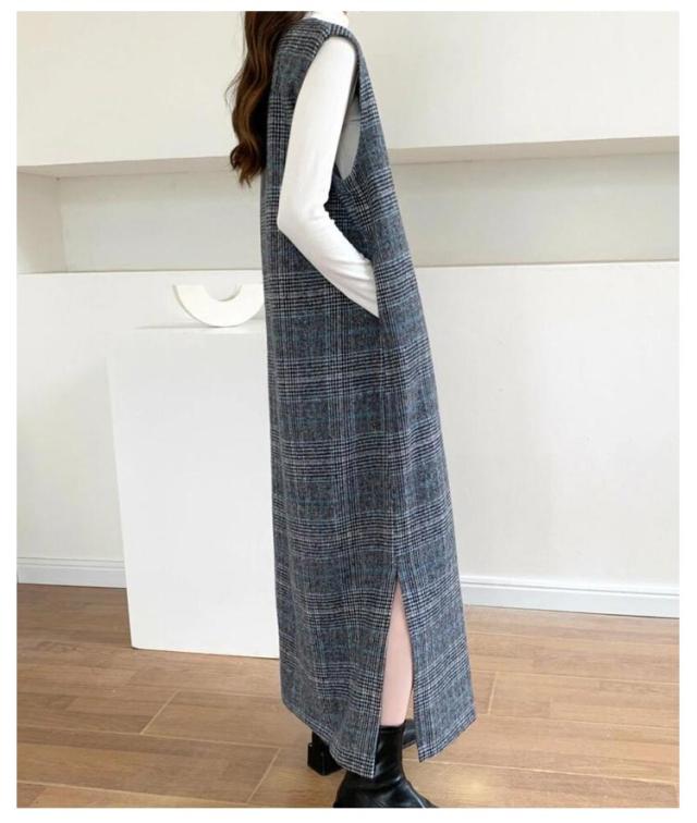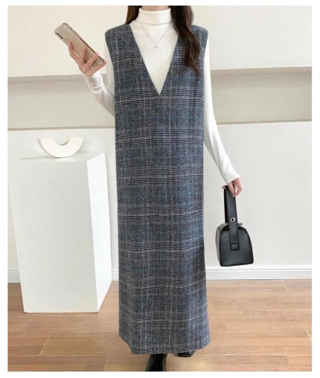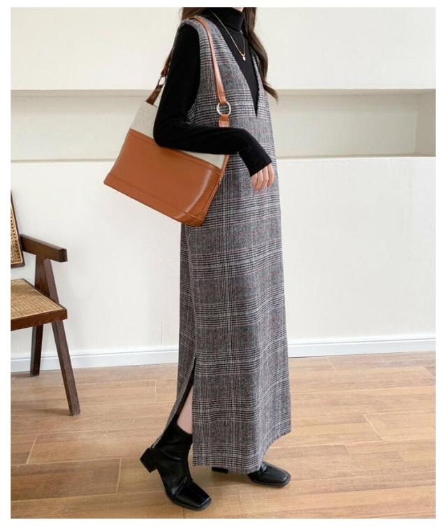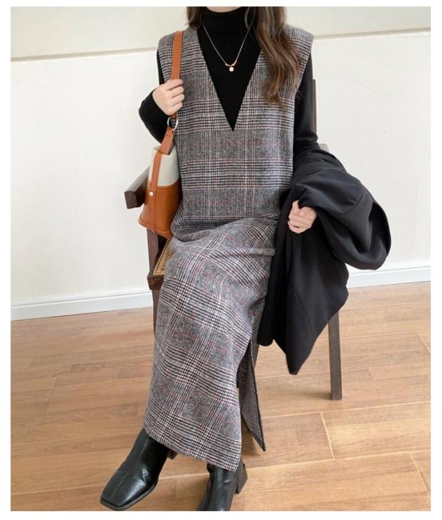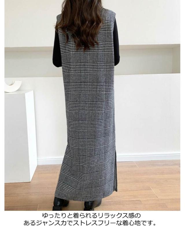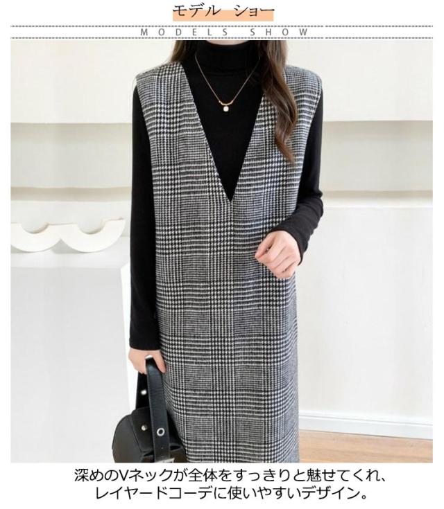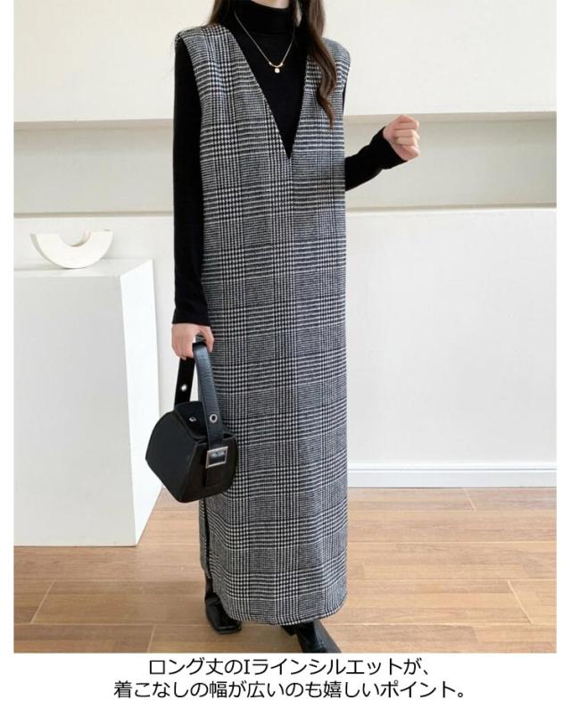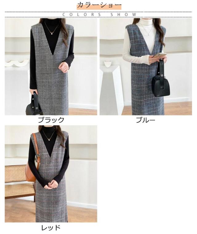 ワンピース レディース グレンチェック ジャンパースカート ロング丈 ノースリブ Vネック チェック柄 カジュアル フォーマル オフェス 通学 通勤 普段着 秋冬 レイヤード 韓国風 スリット入り お洒落 送料無料