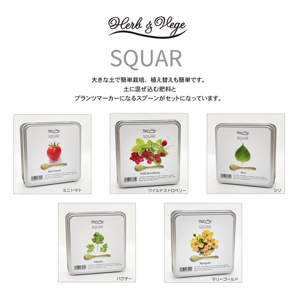 ハーブ&ベジスクエア ワイルドストロベリー ■缶のサイズ:124角×37H(mm) ■内容:タネ、土、説明書、固形肥料、木製スプーン ※記載は商品仕様の一部です。仕様説明不足等の理由での返品はできません。特に適合等は必ずご確認ください。