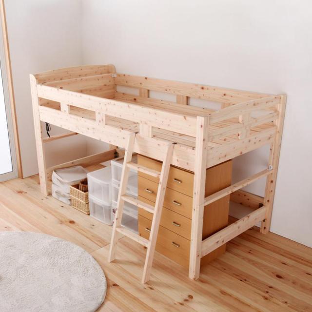 ロフトベッド シングル 国産ひのき 棚コンセント付 天然木 日本製 ( ベット ベッド 木製 桧 檜 ひのき ヒノキ ミドル 宮棚 コンセント すのこ ナチュラル 2way 組み替え )