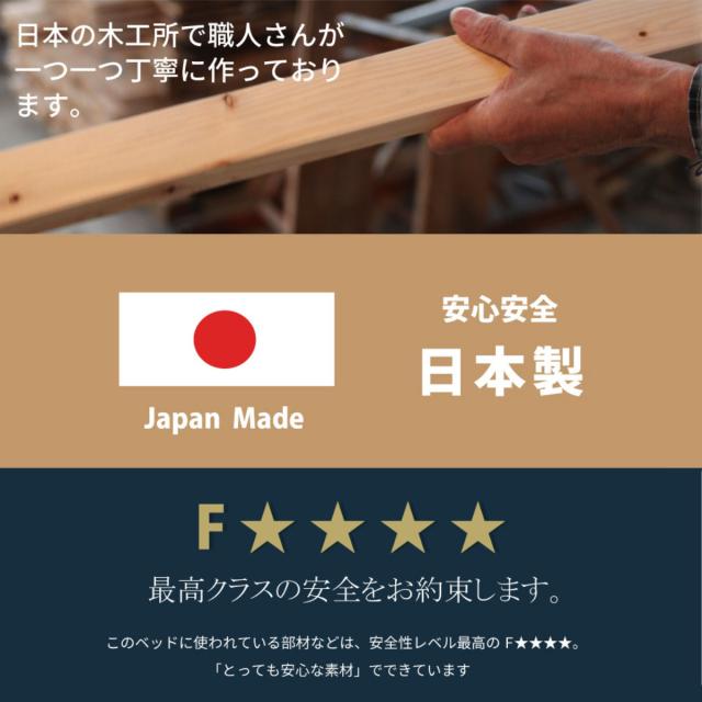 フレームの強度や、サイドガードの高さ、はしごの踏み板の奥行など、細かな品質試験のSE規格と、JIS耐久性試験に合格しています。毎日使うものだからこそ、安全で優れたベッドで安心してお休みください。
