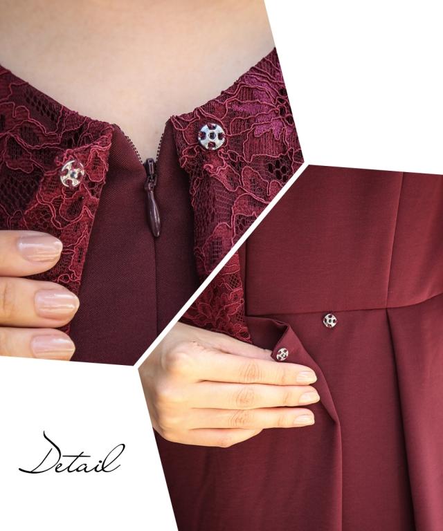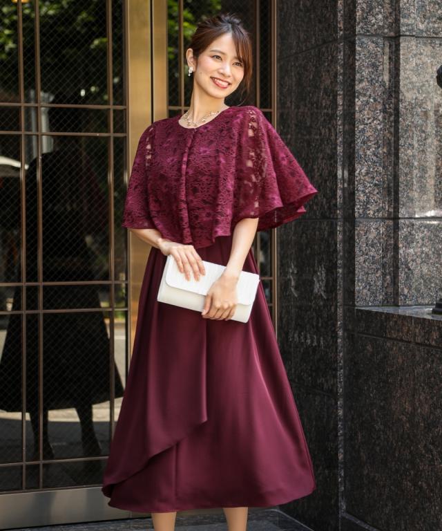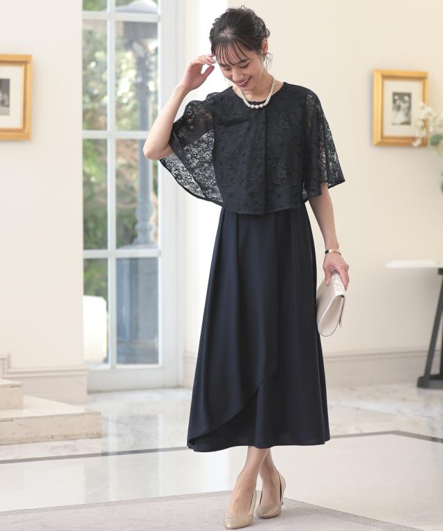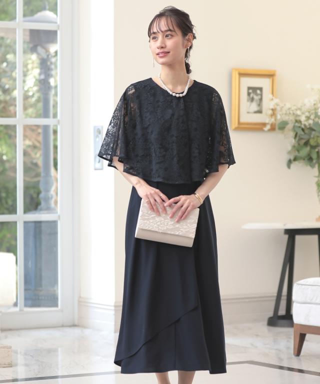 繊細なレースを使用した前開きケープ風ワンピースドレス こだわりポイント おしゃれと着やすさを兼ね備えたワンピースドレス まるでレースケープを羽織ったようなデザイン 前開き仕様なので、着脱楽チン!授乳中の方にもおすすめです スカート部分はふんわりドレープ感が上品な印象を演出してくれます パーティーシーンはもちろん、大切なお呼ばれ・セミフォーマルシーンでも大活躍間違いなし 体型カバーポイント 繊細なレースを使用したゆったりとしたケープが、二の腕を華奢見せ ドレープ感のあるスカートが、膝見えをしっかりカ
