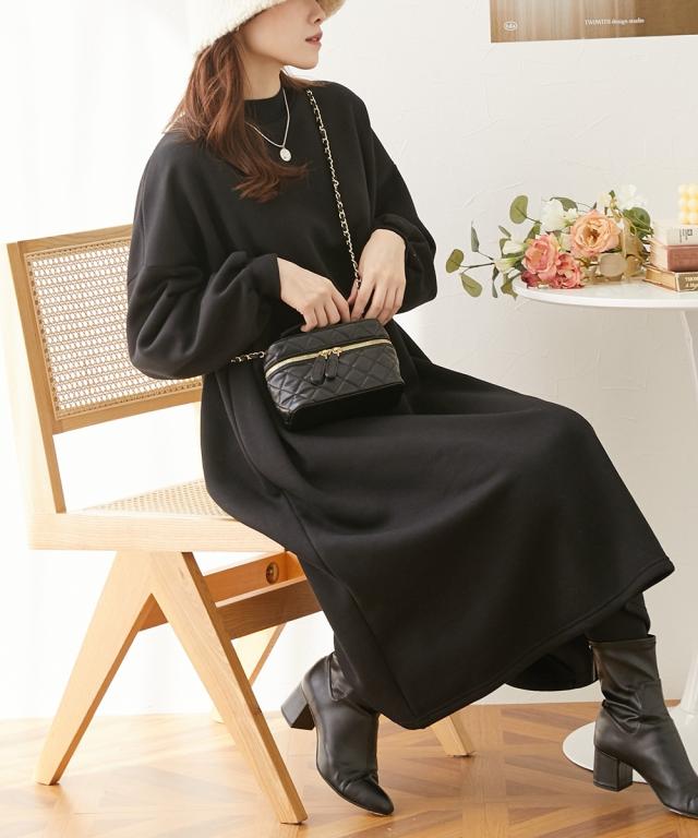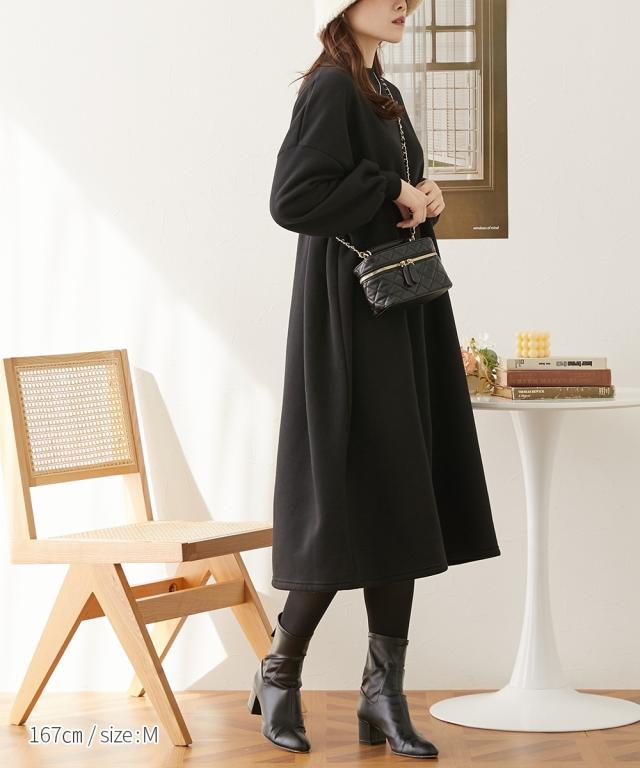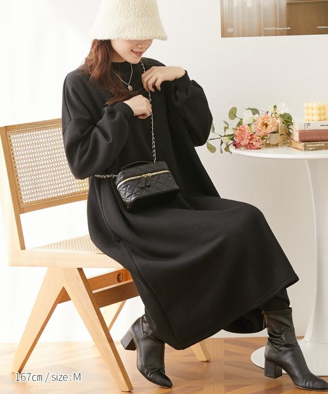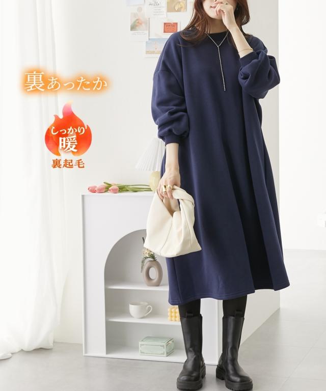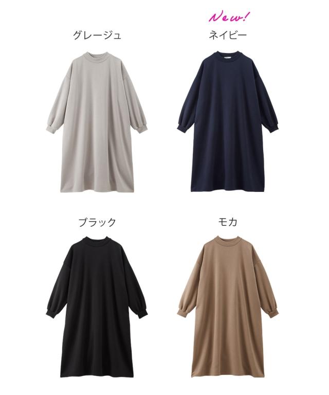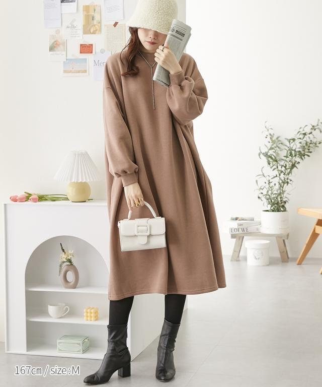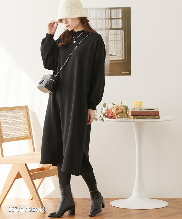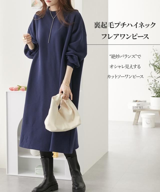 ワンピース ひざ丈 レディース 裏起毛プチ ハイネック フレア 冬 LL