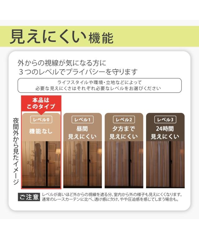素材:ポリエステル100% 遮光:なし 遮熱:なし UVカット:なし 外から見えにくい(遮像):なし 防炎:なし 防音・遮音:なし 形態安定加工:なし 消臭:なし 採光:なし 花粉キャッチ:なし 防カビ:なし 抗カビ:なし はっ水:なし お届け枚数:レースカーテン2枚セット タッセル:なし アジャスターフック:あり フックタイプ:カーテンレールを見せるタイプ(Aフック) ※サイズ表記に記載されている長さは、「フックを引っかける部分(カーテンレールのリング下)から裾までの長さ」となり、総丈はサイズ表記の長さ