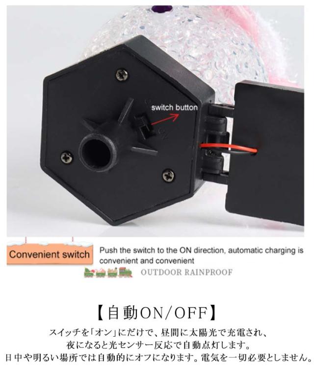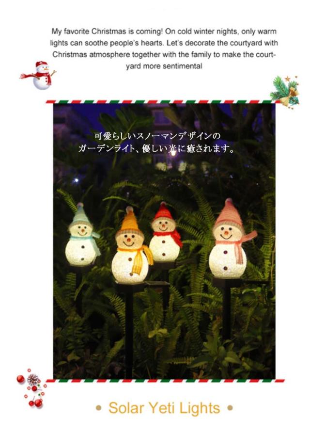 | 電気代ゼロ!可愛い雪だるまライト4本セット 【クリスマスシーズンにピッタリ】可愛らしいスノーマンデザインのガーデンライト、優しい光に癒されます。 【自動ON/OFF】スイッチを「オン」にだけで、昼間に太陽光で充電され、夜になると光センサー反応で自動点灯します。日中や明るい場所では自動的にオフになります。電気を一切必要としません。 【防水機能・耐久性】屋外のソーラーライトを雨や雪にさらす心配はありません。優れた性能を備えたソーラーパネルは防水機能も持っていますので、水がランプボディに浸透するのを防ぎ、回路の腐食を防ぎます。明るく長寿命のLED電球は、長期間使用しても熱を発生しません。耐水性、耐久性があり、長くお使い頂けます。 【簡単設置】平らで十分な日光が当たる場所を選び、金属製杭やポールを地面にしっかりと固定するだけ。 【幅広い用途】家の装飾、道路、芝生、屋外、ガーデン、ベランダ、玄関、パーティー、常夜灯などに適しています。 | |