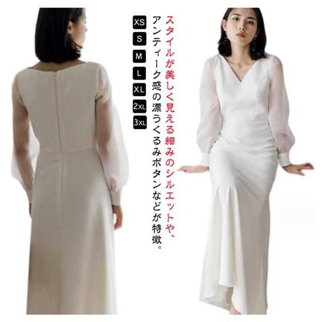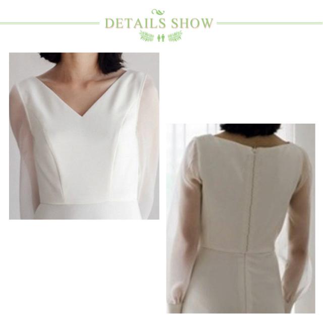 | スタイルが美しく見える細みのシルエットや、アンティーク感の漂うくるみボタンなどが特徴。 Vネックがすっきりとした印象を与え、シフォンの透け感のある長袖がさらに可愛らしさを演出し、気になる上腕部も隠してくれます。 さらりとした触り心地の柔らかい生地とチュール生地の組み合わせで、シンプルなデザインなので大人っぽさを演出してくれます。 前撮り・後撮りだけでなく、結婚式二次会やウェディング、フォーマルな場面などでも使用できます。 | |