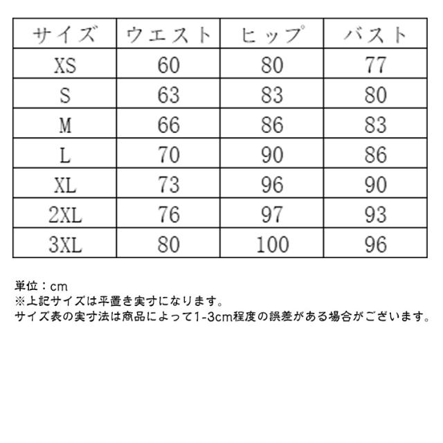 | サイズについての説明 | XS バスト77 ウエスト60 ヒップ80cm S バスト80 ウエスト64 ヒップ84cm M バスト84 ウエスト68 ヒップ88cm L バスト87 ウエスト70 ヒップ90cm XL バスト90 ウエスト74 ヒップ94cm XXL バスト93 ウエスト77 ヒップ97cm 3XL バスト97 ウエスト80 ヒップ100cm |