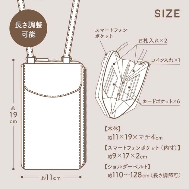 | 商品サイズ | 本体/(約)11×19×4cm(ベルト部含まず)、スマートフォンポケット(内側寸法)/(約)9×17×2cm、ショルダーベルト/(約)全長110〜128cm(調整可) |