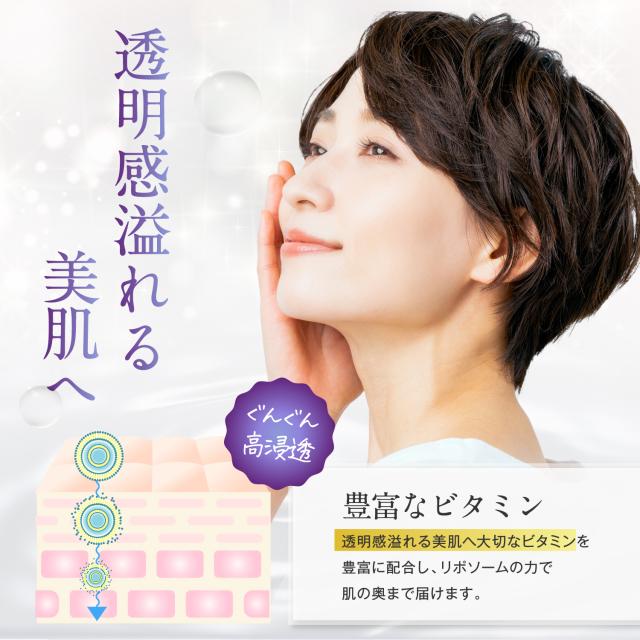 透明感溢れる美肌へ大切なビタミンを豊富に配合し、エイジングケアに肌に必要な栄養をふんだんに配合しておりますので美しさを引き出すお手伝いをします。