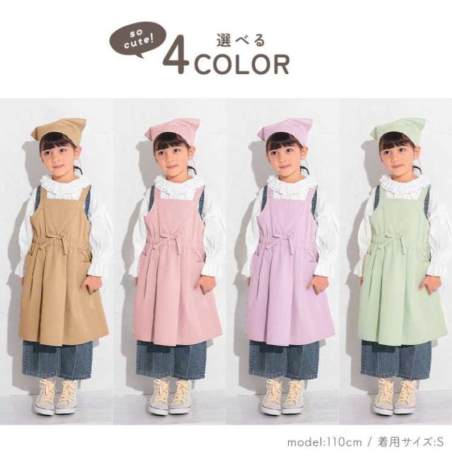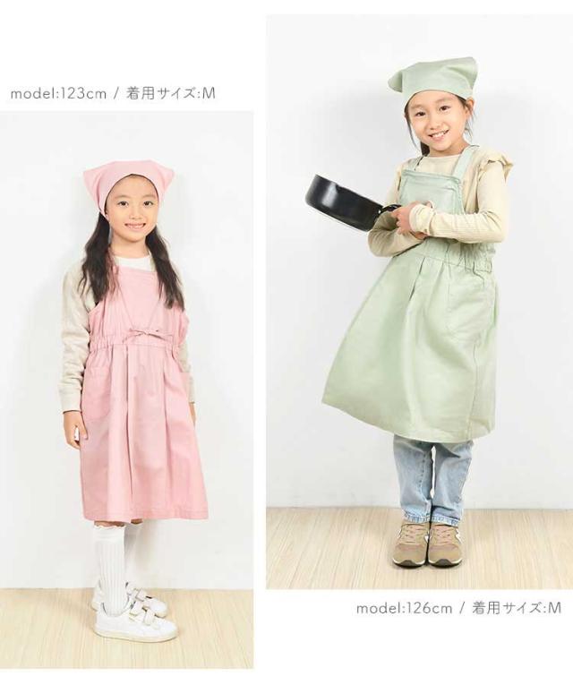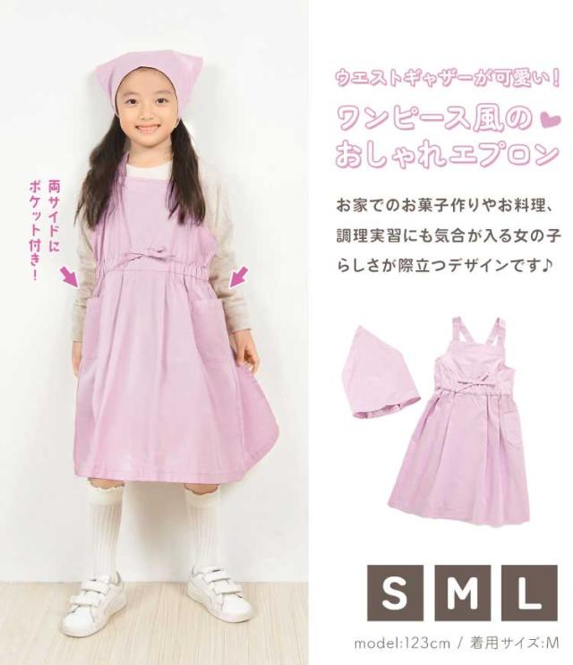 お家でのお菓子作りやお料理、調理実習にも気合が入る女の子らしさが際立つワンピース風のおしゃれなフレアエプロン!小さなお子様から小学生高学年・中学生まで使えるS・M・Lの3サイズ展開です♪ エプロンも三角巾もかぶるだけなのでお子様ひとりでも簡単に着れます★