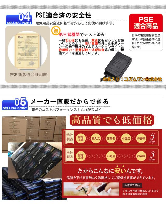 | 通常90日保証付き 点灯検査後出荷しておりますが、取り付け工事前の点灯検査は必ず行ってください。 取付け工事前のLED不点灯(5球以上)については交換いたします。 コードを設置する際、引っ張ったり、ねじったりしないで下さい。 取付け後の不点灯につきましては一切の責任を負いかねます。 |