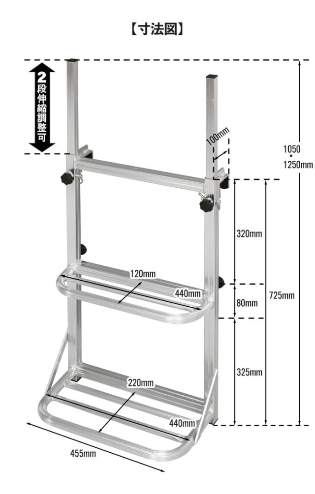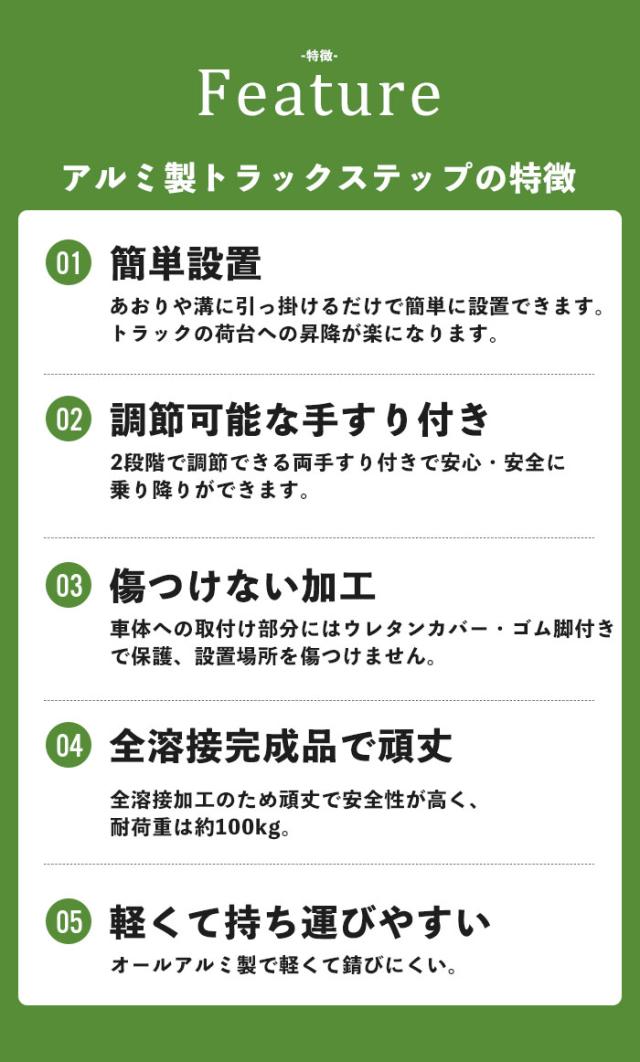 | 昇降設備設置義務化により、必要となったトラックの荷台に安全に上がるための昇降ステップ。 トラックのアオリや溝に引っ掛けるだけの簡単設置。 車体への取付け部分はウレタンカバー、ゴム脚付きで保護、設置場所を傷つけません。 (取付可能な厚さ:5.5cm) オールアルミ製でさびにくい、軽いので持ち運びもラクラク。 全溶接加工のため、丈夫で安全性も◎ 4点支持確保で乗り降りが安全。 |