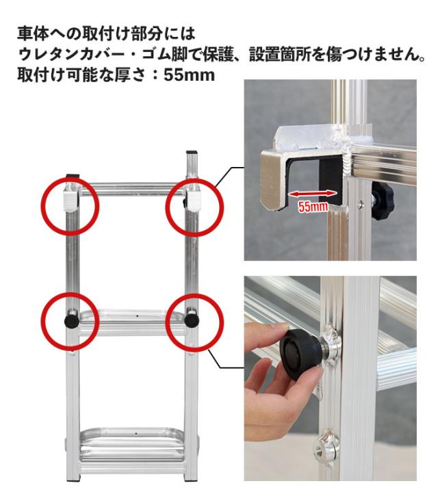| 昇降設備設置義務化により、必要となったトラックの荷台に安全に上がるための昇降ステップ。 トラックのアオリや溝に引っ掛けるだけの簡単設置。 車体への取付け部分はウレタンカバー、ゴム脚付きで保護、設置場所を傷つけません。 (取付可能な厚さ:5.5cm) オールアルミ製でさびにくい、軽いので持ち運びもラクラク。 全溶接加工のため、丈夫で安全性も◎ |
