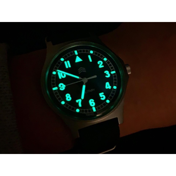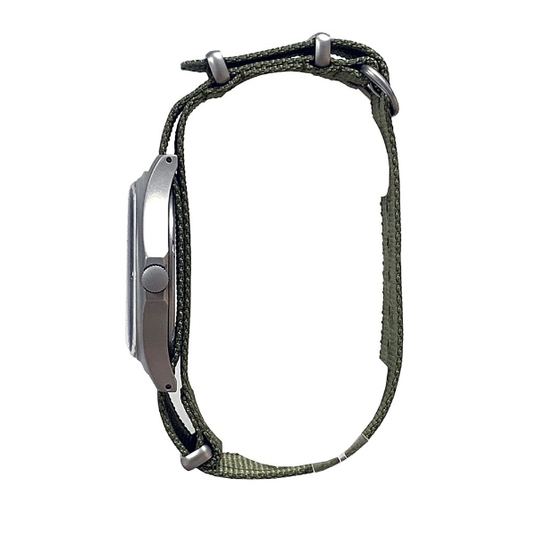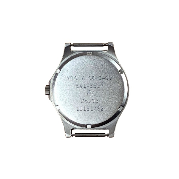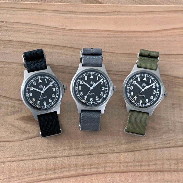 英国陸軍仕様をベースに、当時のミルスペックを忠実に再現しつつ、サイズ感をアップデートしてケース径を38ミリに拡大しました。ケース及びケースバック素材は316Lステンレススティールを採用。風防はアンティーク感を出すためにアクリル製ドーム風防を復刻。スイス製クォーツムーブメントを採用し、機能面でも現代の使用に耐えうる製品となってます。文字盤上の数字・インデックス・針の蓄光塗料にはスイス製腕時計にしか使用を許されていない「LumiNova(R)」塗料を採用し、通常のルミナスより蓄光時間・光が強化されています。防水面でも5気圧防水構造ですので日常の水仕事・作業にも充分使用していただけます。
