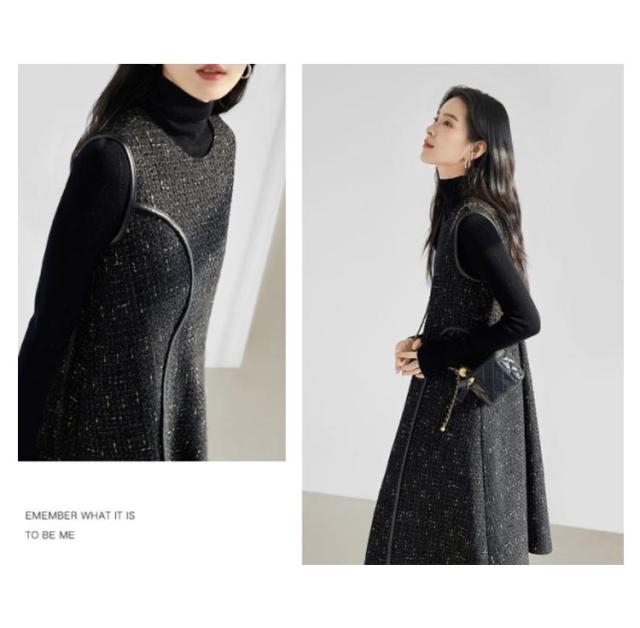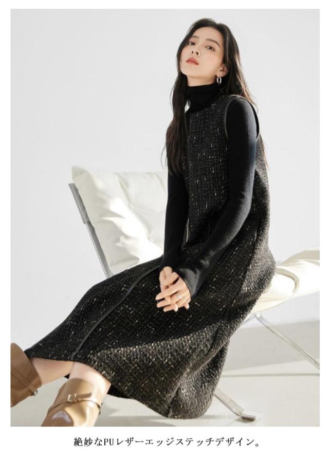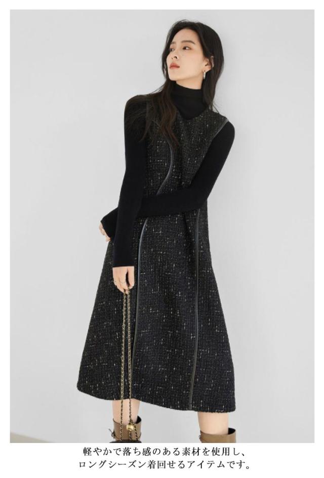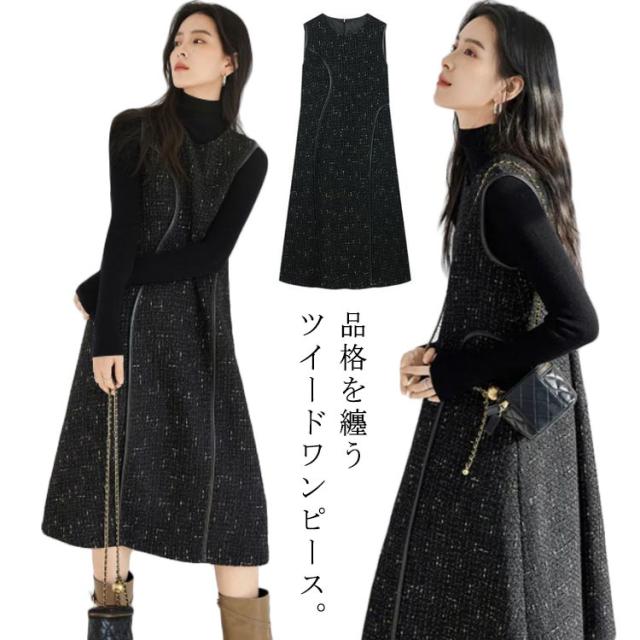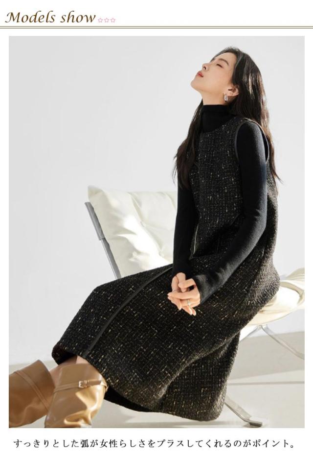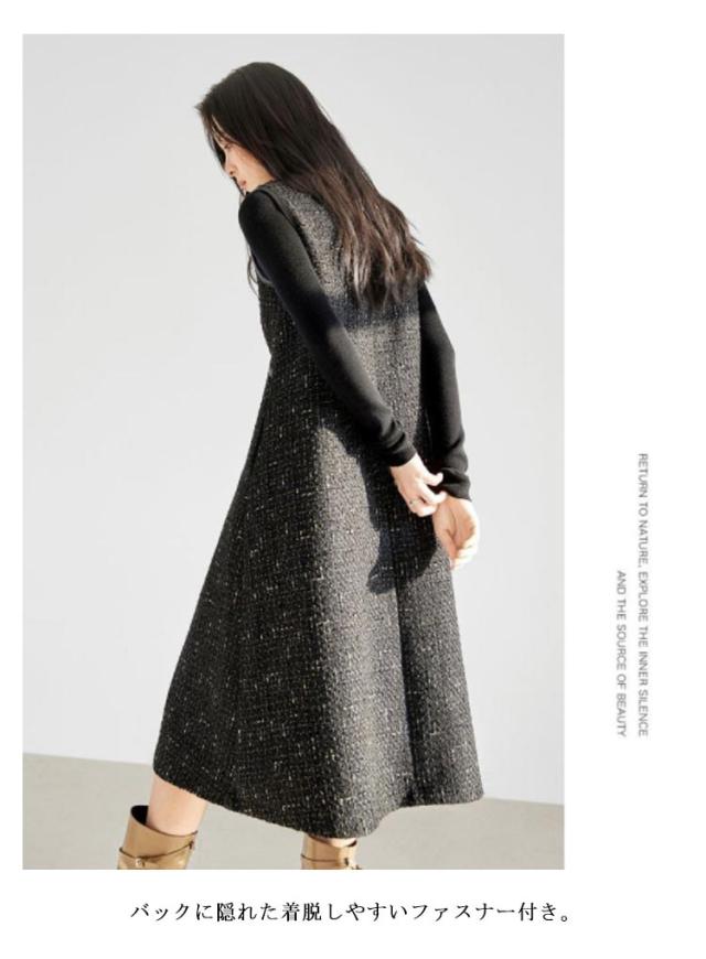 レイヤード風 重ね着 ノースリーブ 冬 秋 ツイード Uネック Aライン ロング丈 レディース 春 ジャンスカ フォーマル ジャンパースカート クルーネック 体型カバー 可愛い 大きいサイズ カジュアル 着痩せ 通勤 入学式 入園式 オフィスカジュアル ワンピース 上品