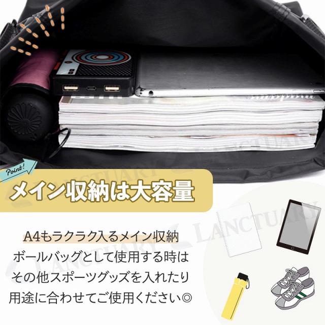 メインの収納部分はA4サイズもラクラク入る大容量。収納力抜群でボールの他にスポーツ用のシューズなどを入れるなど用途に合わせてご使用ください。