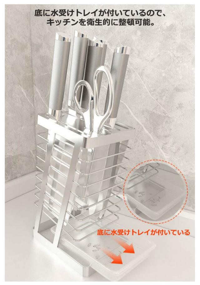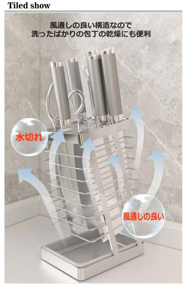 | 空気の通り道もあるので、清潔を保つことが可能!水洗いも可能。 風通しの良い構造なので洗ったばかりの包丁の乾燥にも便利 垂直に収納するため、水キレも良く、刃も隠れますので怪我を防止 包丁やナイフ、ハサミを入れる場所が7個あるので、様々な種類の包丁を収納可能 ステンレス製なので錆びにくく衛生的 底に水受けトレイが付いているので、キッチンを衛生的に整頓可能 | |