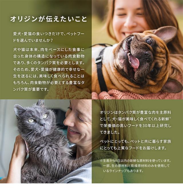「オリジン キトゥン」は、子猫が健康で丈夫に成長するために特別に作られたキャットフード。鶏肉や七面鳥、サーモン、サバ、ニシン、ポロック油など、高品質な動物性原材料を全体の90%使用し、素材の中でも特に栄養のある肉や内臓、骨などを余すところなく配合。新鮮または生の原材料が15種類も含まれています。また、魚に含まれるDHAとEPAは、子猫の脳の発達や認知機能をサポートします。子猫の成長に欠かせない高品質な動物性タンパク質がたっぷり含まれた「キトゥン」は、お客様の愛猫が元気に成長する手助けをします。