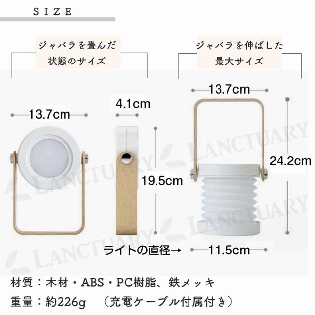 | 主な仕様 | 【サイズ】 ジャバラを畳んだ時 : 19.5cm×13.7cm×4.1cm ジャバラ最大時:24.2cm×13.7cm×11.5cm ライト部 : 直径11.5cm 持ち手 : 幅4.1cm 重量:約246g 充電ケーブル付き 【材質】木材・ABS・PC樹脂、鉄メッキ 【カラー】ホワイト、グレー |