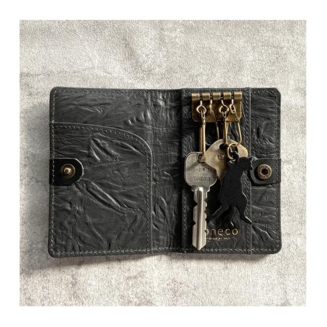 やわらかく手になじむ革を使用し、ひとつひとつ職人が丁寧に仕立てています。ポケットのカタチでさりげなくネコ要素をプラス。可愛くなりすぎない大人なネコアイテムです。鍵は4箇所つけることができます。ホックがついているので、鞄の中でも広がりません。外側と内側にポケットがひとつずつ交通系のカードを入れたりと使い勝手の良い仕様になっています。