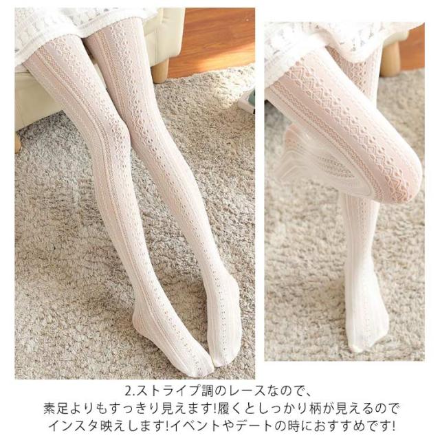 | 1.伸縮性が高く、履いていてフィット感もしっかりあります。レース柄なので可愛らしくも大人っぽくも履けます。 2.ストライプ調のレースなので、素足よりもすっきり見えます!履くとしっかり柄が見えるのでインスタ映えします!イベントやデートの時におすすめです! 3.つま先まで柄が入っているので、サンダルや オープントウパンプスにもおススメです。 4.豊富なカラバリでコーディネートを楽しめます。 | |