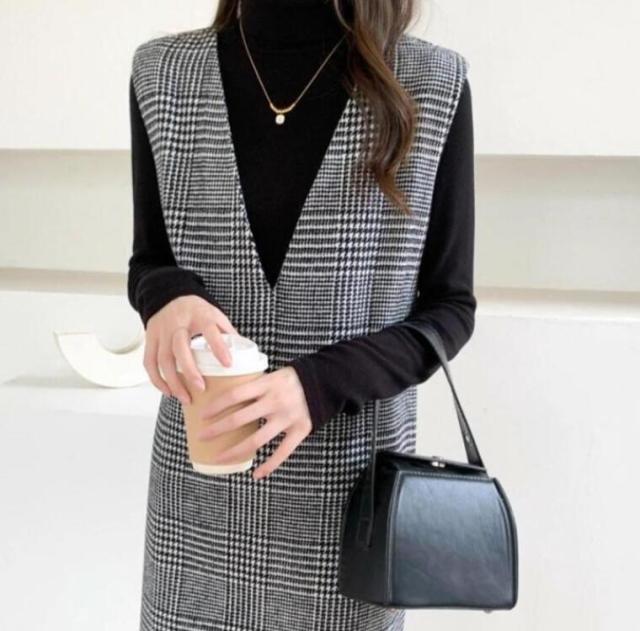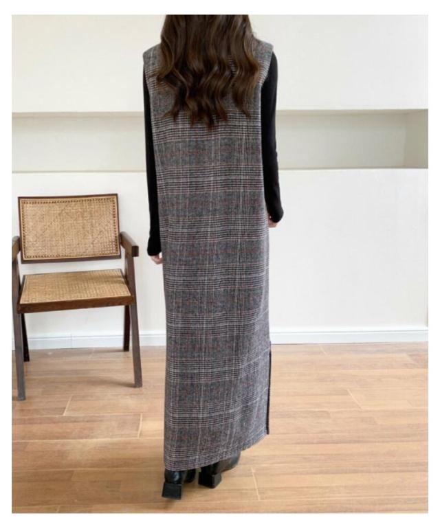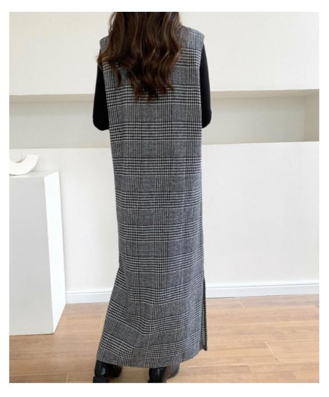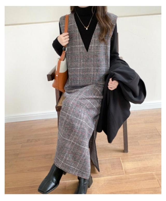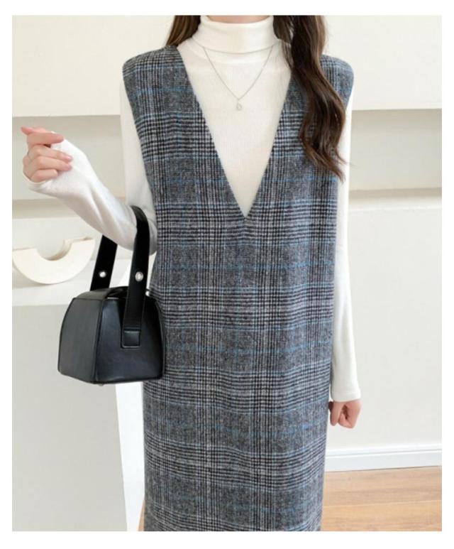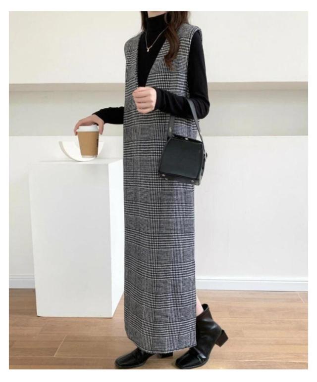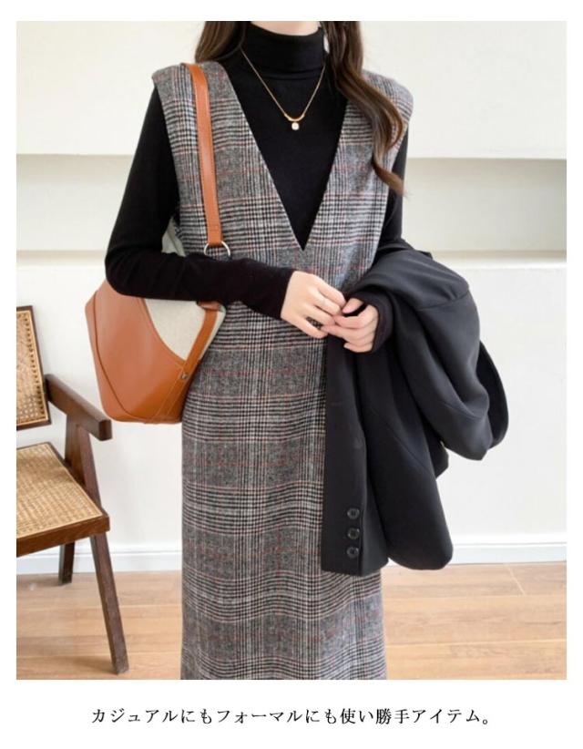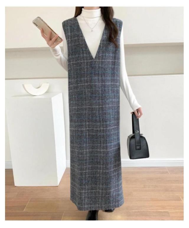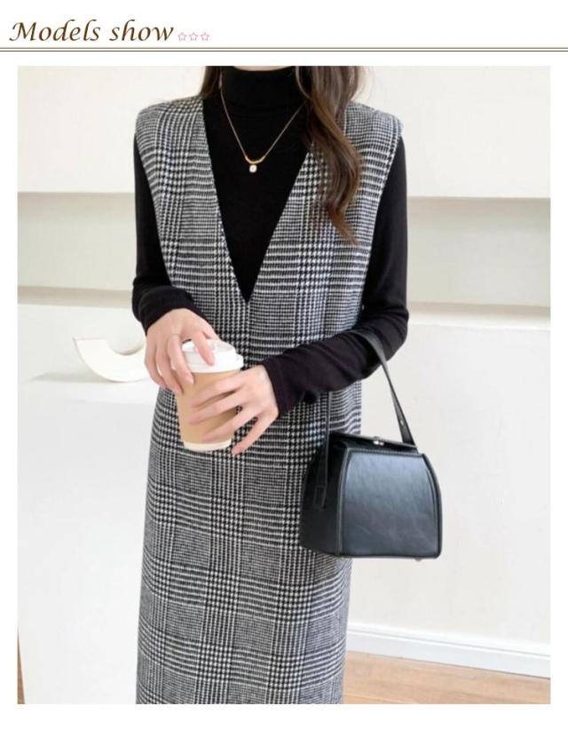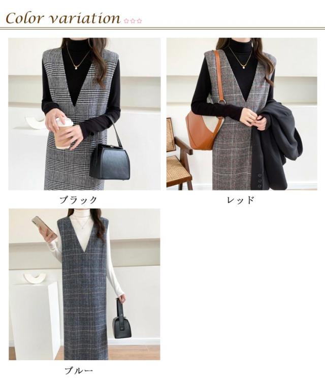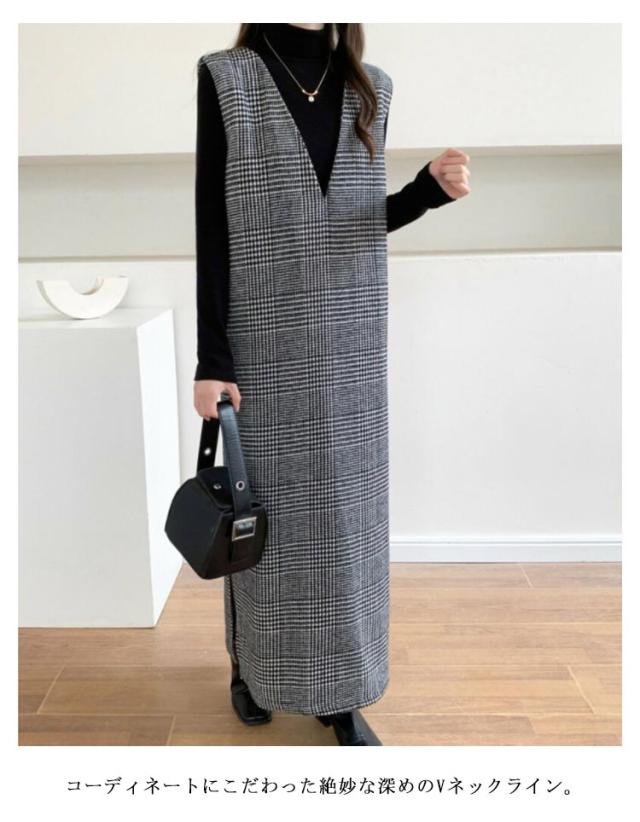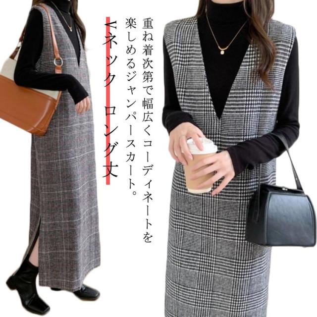 春 レディース チェック柄 冬 大きいサイズ 秋 Vネック レイヤード風 ロング丈 ジャンスカ ジャンパースカート ノースリーブ 重ね着 ワンピース 体型カバー 可愛い ワンピース カジュアル 着痩せ 通勤 入学式 入園式