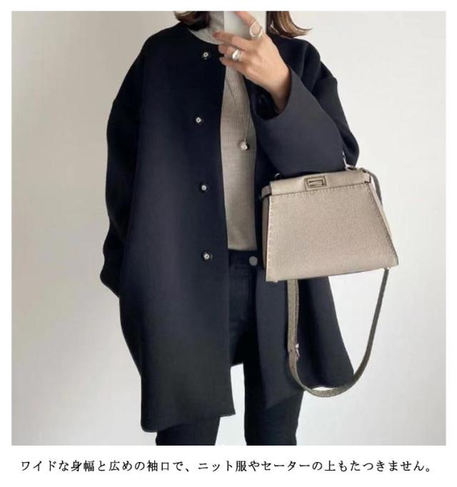 | シンプルで何にでも合わせられる万能コート。 定番のデザインで長く使えるミドル丈ノーカラーコートは合わせるアイテムやスタイリングを選ばず使えるのでマストバイアイテム◎ 柔らかい素材感と軽くて羽織りやすいのに、暖かくインナーの調整もしやすい万能コート。 ストレートのすっきりとしたシルエットで、気になる体型も全身カバー◎ ワイドな身幅と広めの袖口で、ニット服やセーターの上もたつきません。 どんなコーデにもマッチする使い勝手の良いコートで、普段使いだけでなく、通勤や通学、デートや記念日、お呼ばれやパーティー、食事会やイベント、学校行事やアウトドア、旅行やお散歩など様々なシーンでお使いいただけますよ。 | |