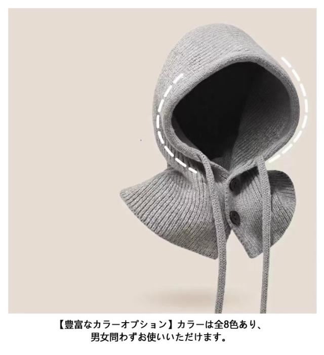 | 今季大注目のバラクラバニットフーディが登場! 帽子としてはもちろん、フード付きネックウォーマーにもなる2way仕様です。 もちもちした柔らかいニット素材で寒い日もあたたか 【肌に優しく柔らかな素材】快適でソフトなタッチ、肌へのケア 【小顔効果も抜群】ゆったりとしたフィット感で着心地が良く、小顔に見えるフード付きネックウォーマーです。 【着脱が簡単】フロントにボタンが付いているので、屋内と屋外の切り替えが簡単に行えます。 【豊富なカラーオプション】カラーは全8色あり、男女問わずお使いいただけます。 | |