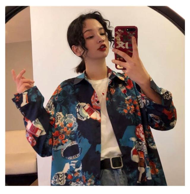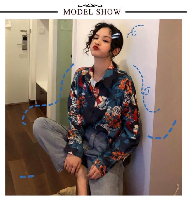 レディース トップス レトロ アロハシャツ 花柄シャツ レトロ柄 サテン 長袖シャツ プリントシャツ サテンシャツ レトロ カジュアルシャツ 花柄シャツ 韓国ファッション ストリート カジュアル 長袖 シャツ 韓国
