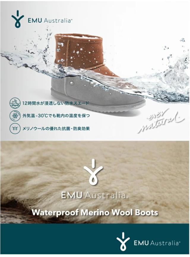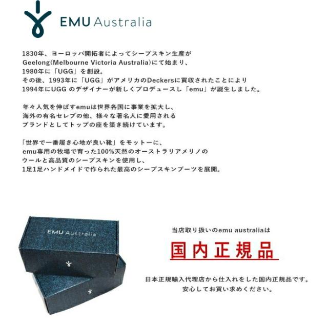 1830年、ヨーロッパ開拓者によってシープスキン生産がGeelong(Melbourne Victoria Australia)にて始まり、1980年に「UGG」を創設。 その後、1993年に「UGG」がアメリカのDeckersに買収されたことにより1994年にUGGのデザイナーが新しくプロデュースし「EMU Australia」が誕生しました。 年々人気を伸ばすEMU Australiaは世界各国に事業を拡大し、海外の有名セレブの他、様々な著名人に愛用されるブランドとしてトップの座を築き続けています。 「世界で一番履き心地が良い靴」をモットーに、EMU Australia専用の牧場で育った100%天然のオーストラリアメリノのウールと高品質のシープスキンを使用し、1足1足ハンドメイドで作られた最高のシープスキンブーツを展開。