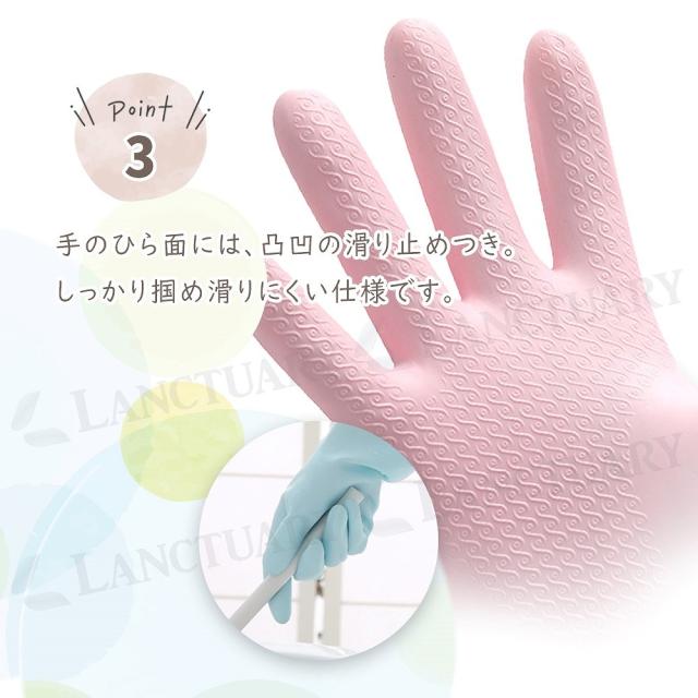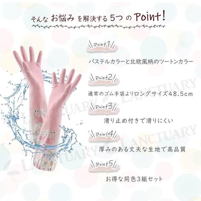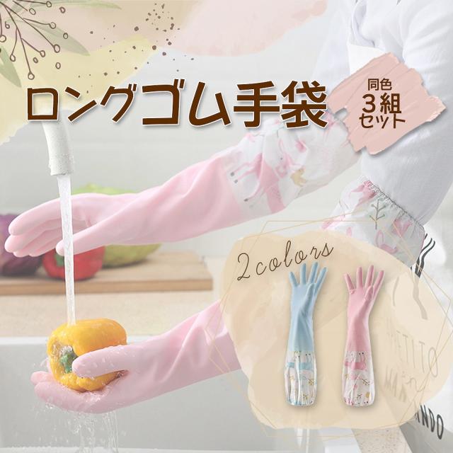 ゴム手袋 同色3組セット 厚手 ロンググローブ 防水 防寒 滑りにくい 北欧柄 かわいい パステルカラー ブルー ピンク 食器洗い 掃除 ガーデニング 洗車 介護 agesugi_snk