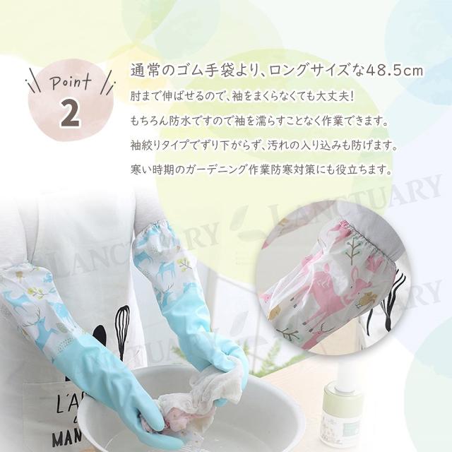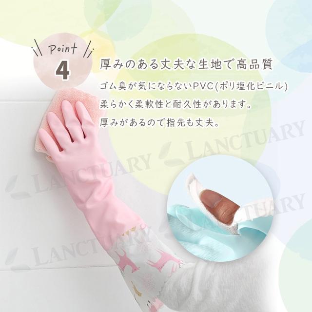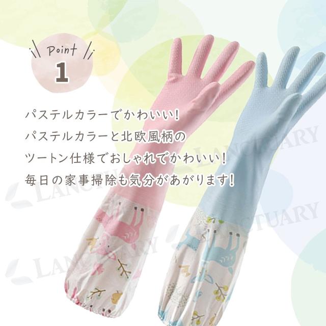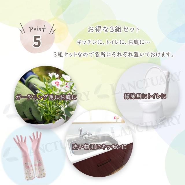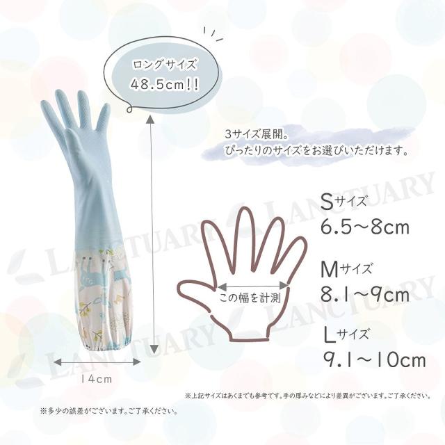 | 商品の説明 | かわいいロング丈のゴム手袋。 お得な同色3組セット。 【パステルカラーでかわいい】 ・パステルカラーと北欧風柄のツートン仕様でおしゃれでかわいい!毎日の家事掃除も気分があがります! 【ロングサイズ】 ・通常のゴム手袋より、ロングサイズな48.5cm。 肘まで伸ばせるので、袖をまくらなくても大丈夫!もちろん防水ですので袖を濡らすことなく作業できます。袖絞りタイプでずり下がらず、汚れの入り込みも防げます。寒い時期のガーデニング作業防寒対策にも役立ちます。 【滑り止め】 ・手のひら面には、凸凹の滑り止めつき。 しっかり掴め滑りにくい仕様です。 【PVC素材】 ・厚みのある丈夫な生地で高品質。 ゴム臭が気にならないPVC(ポリ塩化ビニル)で、柔らかく柔軟性と耐久性があります。 【お得な3組セット】 ・お得な同色3組セット。 キッチンに、トイレに、お庭に… 各所に置いておけます。 |