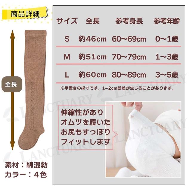| 主な仕様 | 【サイズ】 S 0~1歳、M 1~3歳 、L 3~5歳 S:全長約46cm、参考身長60~69cm M:全長約51cm、参考身長70~79cm L:全長約60cm、参考身長80~89cm ※ウエストはゴムで伸縮性があります 【素材】綿混紡 【カラー】モカ・アイボリー・モカベージュ・ピンク |
