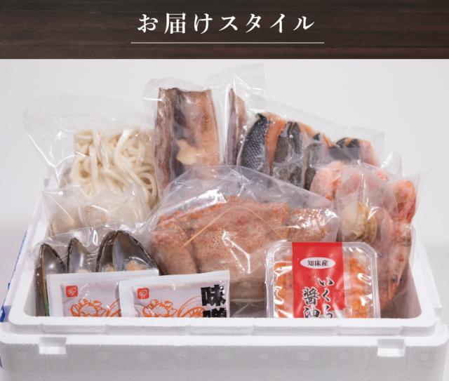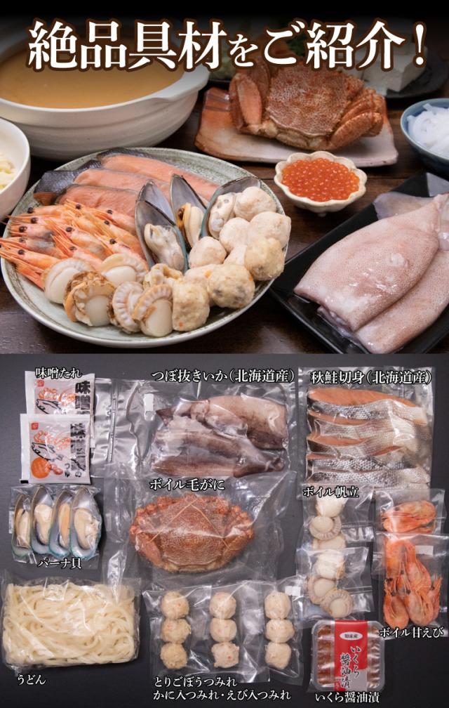| ボイル毛がに400g・秋鮭切身40g×6・つぼ抜きいか100g×2・ボイル帆立6・ボイル甘えび12・パーナ貝4・いくら醤油漬け80g・とりごぼうつみれ3・かに入つみれ3・えび入つみれ3・うどん250g・味噌たれ50g×2 |