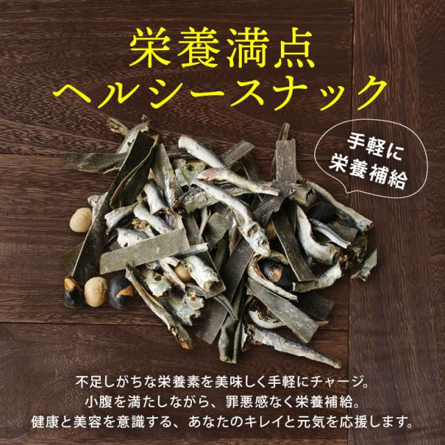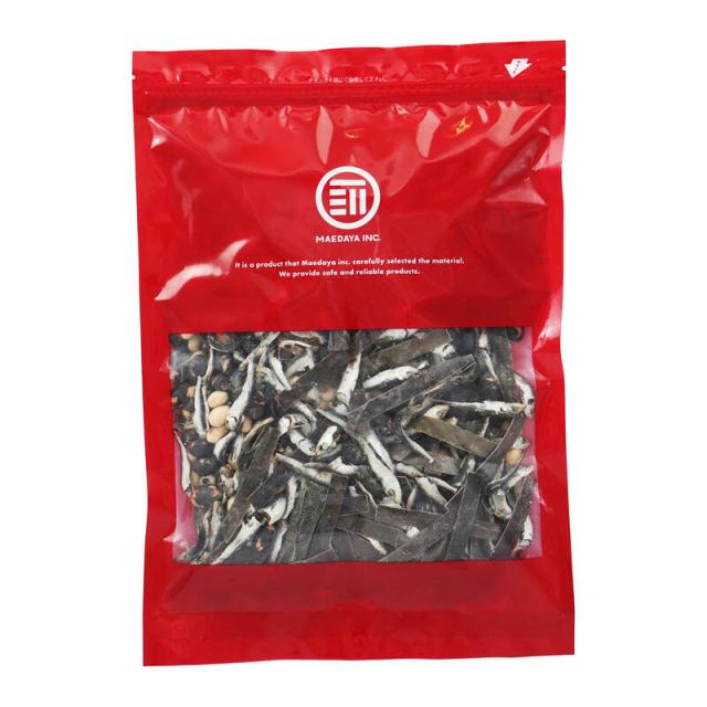 ◆原材料:カタクチイワシ煮干(カタクチイワシ(瀬戸内海産)、食塩)、国産大豆、国産黒豆、昆布(中国産)、醸造酢、澱粉分解物、ブドウ糖、調味料(アミノ酸等)、ソルビット、酸味料、甘味料(甘草、ステビア)(原材料の一部に小麦、大豆を含む)「本品製造工場では、落花生を含む製品を生産しています。」