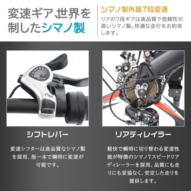 - 信頼のシマノ製7段ギアを装備しており、走行環境を応じて調節でき、身体にかかる負担を軽くなります。