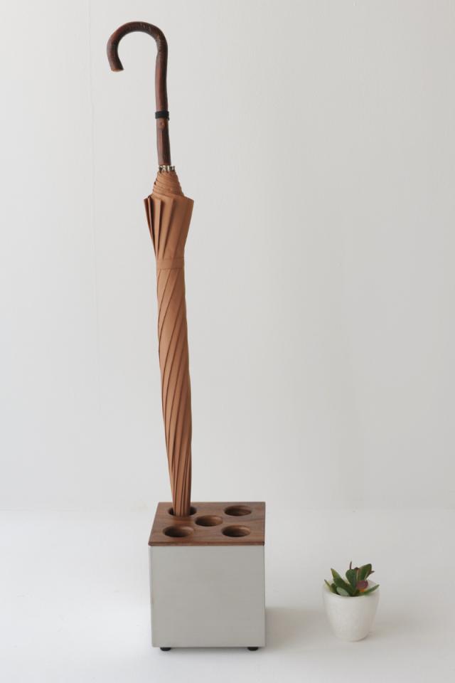 耐久性のあるステンレスと木の温もり溢れる天然木を組み合わせた室内用傘立てです。長傘を5本収納できるので、一人住まいにも家族住まいにもおすすめです。玄関のちょっとしたアクセントになる、洗練されたデザインに仕上げています。