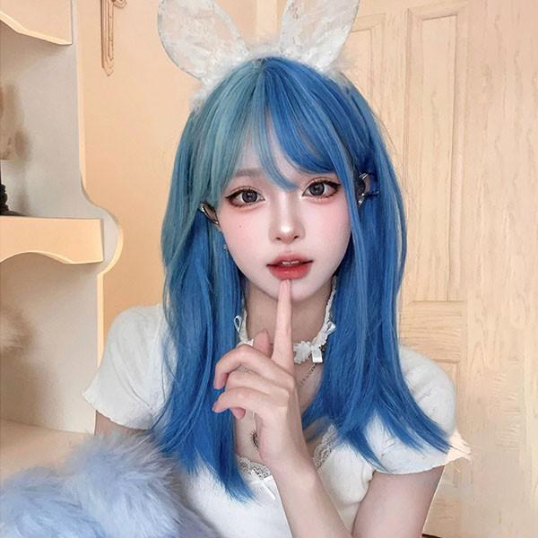 ウィッグ レディース フルウィッグ ミディアムウィッグ メッシュ グラデーション ストレート ブルー ぱっつん前髪 前髪あり 可愛い かわいい 大人用 コスプレ ロリータ ゴスロリ コスチューム 原宿風 仮装 超自然 かつら wig Lolita 小顔 文化祭 イベント 学園祭 ハロウィン dq107n1n1l9