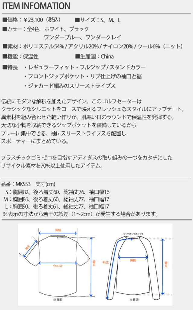 アディダス ゴルフ スリーストライプス 防風 長袖ライニングセーター レディース ゴルフ ウェア 「Adidas Golf MKS53」 リサイクル素材