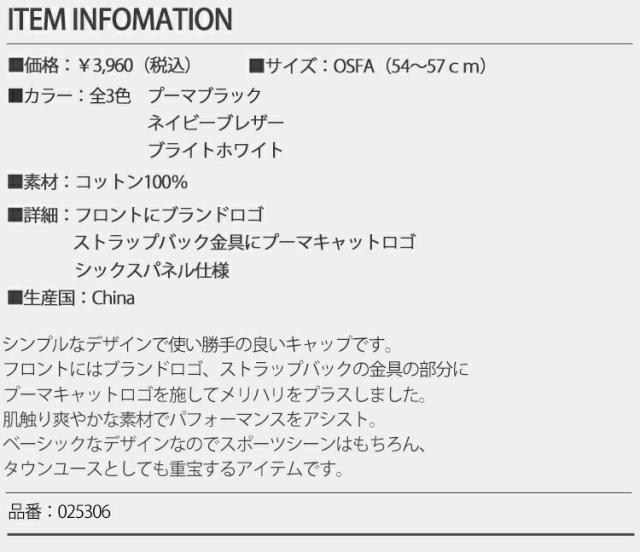 | 特長 | ・フロントにブランドロゴ ・ストラップバック金具にプーマキャットロゴ ・シックスパネル仕様 |