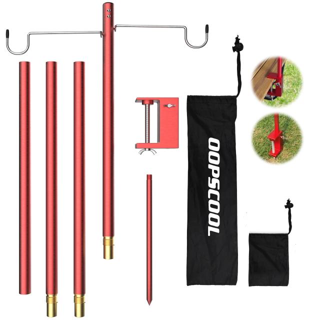 【2WAYペグ&卓上式-簡単に組み立て可能】ランタンスタンドは地面に刺し込んだり、卓上に設置することができます。ペグを使えば、お好きな場所に取り付け可能です。卓上に設置する場合は、付属のクランプを使えば、スペースを節約することができます。高い位置から360度の光を得ることができ、美しい雰囲気を演出できます。<br>【高さ調節可能&ダブルフック設計】ランタンポールの長さは4段階に調節でき、約32cm、65cm、93cm、125cmの高さに設置することができます。卓上に置く場合は、高さを低く設定することもできます。注目点:ランタンフックが2つ付属し、最大耐荷重は約2kg(2*1kg)です。ポールが重さでしなる場合は、ランタンハンガーの長さを短く調節してみてください。ペグを使用する場合は、地面にしっかりと固定されていることを確認してください。<br>【アルミニウム合金・耐久性と防錆性】ライトスタンドはスタイリッシュなカラーとともに、耐久性があります。高品質なアルミニウム合金製のランタンポールで、強度を高めながら、アルミニウムの軽量性を兼ね備えています。<br>【用途はアウトドアに様々】キャンプのランタン設置に限らず、釣りやBBQ、ビーチなど、様々なアウトドアツアーに使用することができます。コンパクトで持ち運びも便利です。<br>【コンパクトで持ち運びが便利】ランタンスタンドの総重量は約350gで、市販のボトルウォーター程度の重さです。収納時のサイズは35×6×5.5cmで、収納場所に困りません。セット内容は、ランタンポール×4、フック×2、クランプベース×1、ペグ×1、収納袋×2です。<br>◆商品名:ランタンスタンド ハンギングラック キャンプ ライトスタンド コンパクトで軽量アルミ製ランタンポール フック2個付きで 卓上式・打ち込<br>