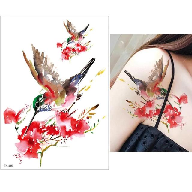 大きいサイズのハチドリと花をデザインした水で貼るフェイクタトゥーステッカー。