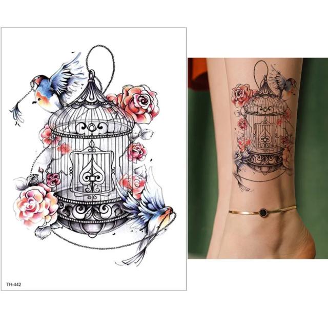 大きいサイズの鳥篭と幸せ青い鳥と薔薇の花をデザインした水で貼るフェイクタトゥーステッカー。