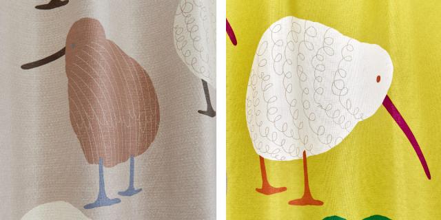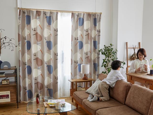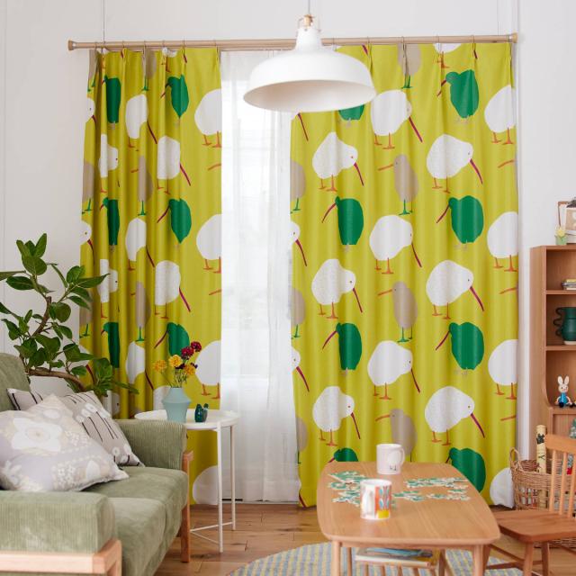 ニュージーランドの国鳥、キーウィ柄です。まん丸なフォルムと長いくちばしがとっても愛らしく、カーテンを閉めた状態でもお部屋の雰囲気を明るくしてくれます。リビングやお子様のお部屋にぴったりのカーテンです。