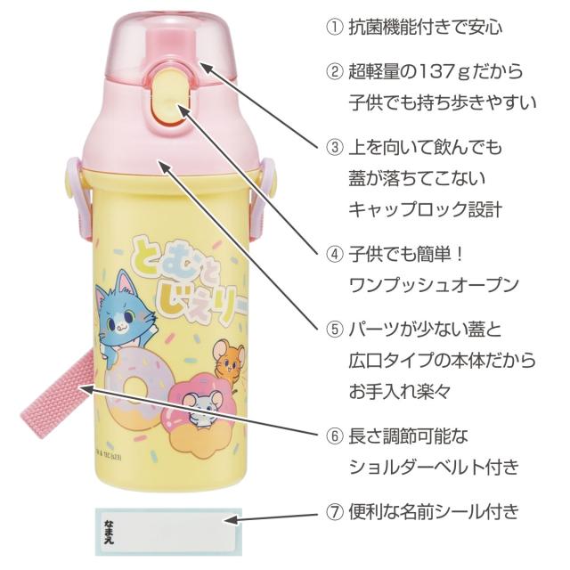水筒 480ml 抗菌直飲プラボトル トムとジェリーごっこ ( トムとジェリー 子供用 抗菌 プラスチック製 ダイレクトボトル 直飲み ワンタッチ 日本製 抗菌加工 AG 銀 ショルダーベルト付き 広口 軽量 ボトル ワンプッシュ )