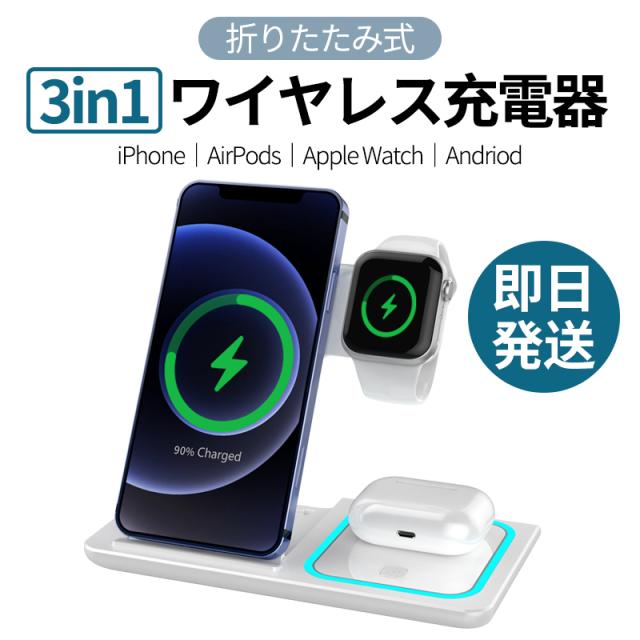 最新型iPhone、Airpods、Apple Watch 三台同時充電可能なワイヤレス充電器!Qi対応のAndriodスマホにもお使いいただけます。15W高速充電仕様、折りたたみ可、収納や持ち運び便利です。