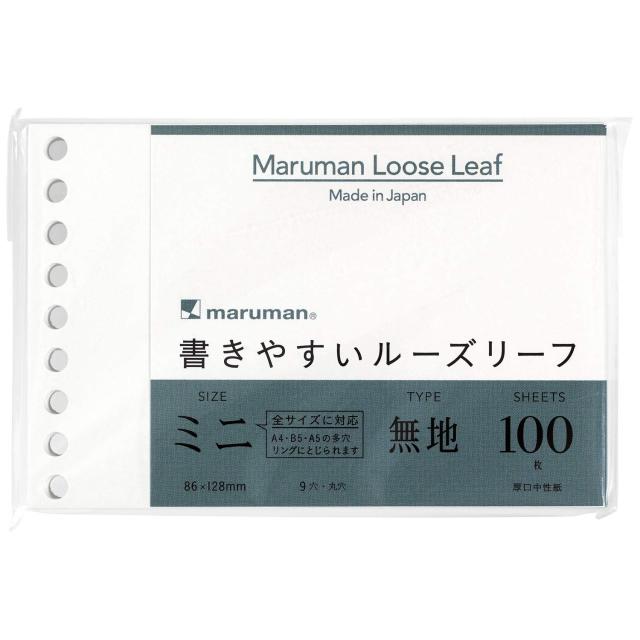 自由になんでも書ける、描ける。インクの色も引き立つ無地。<br>【サイズ】B7変形(ミニサイズ 9穴) (縦86×横129mm)<br>【本文】無地 マルマンオリジナル筆記用紙80g/m2<br>【枚数】100枚×10冊セット<br>書き味の良いオリジナル国産筆記用紙<br>◆商品名:マルマン ルーズリーフ ミニ B7 無地 100枚 10冊セット L1433<br>【自由になんでも書ける無地のルーズリーフミニサイズ】